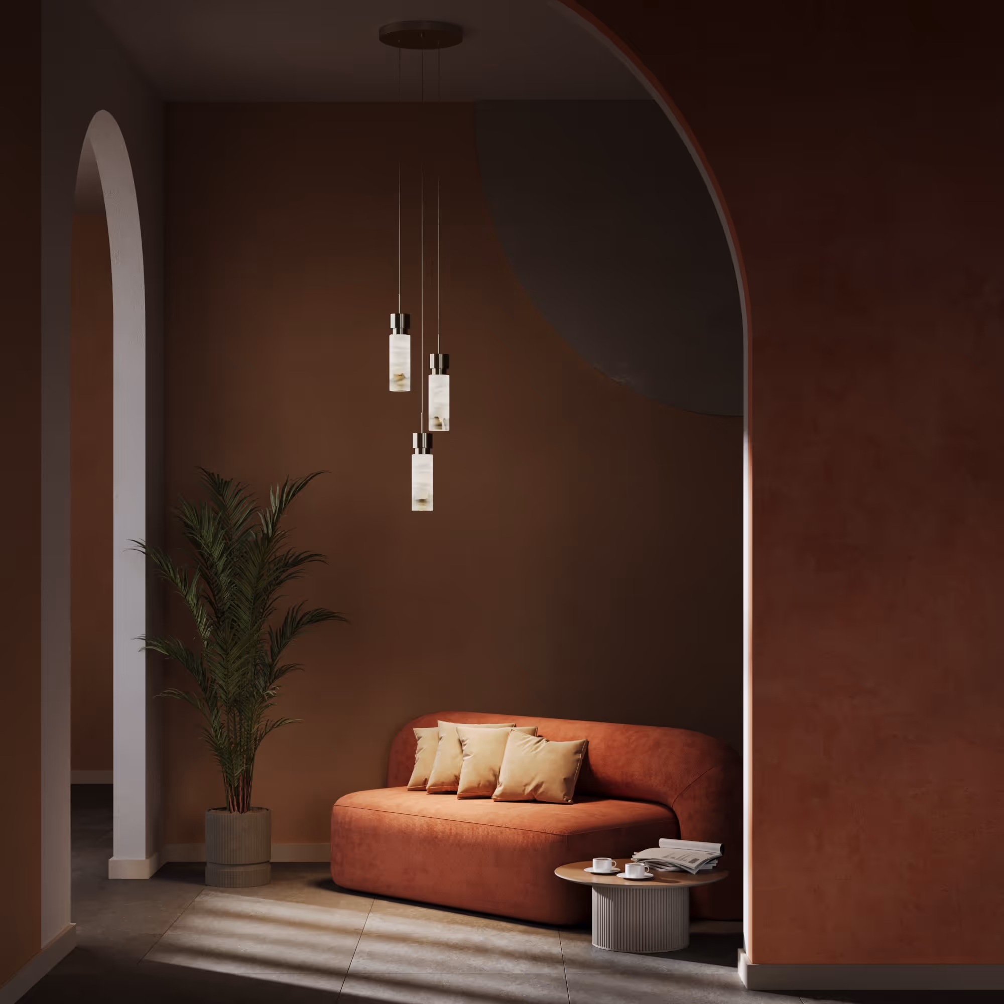 The ALTA pendant features a sleek cylindrical alabaster diffuser paired with precision metal detailing, delivering a directional, downward-focused beam ideal for accent and task lighting. Its refined vertical profile and sculptural presence make it a strong choice for hospitality, residential, or gallery-style interiors.