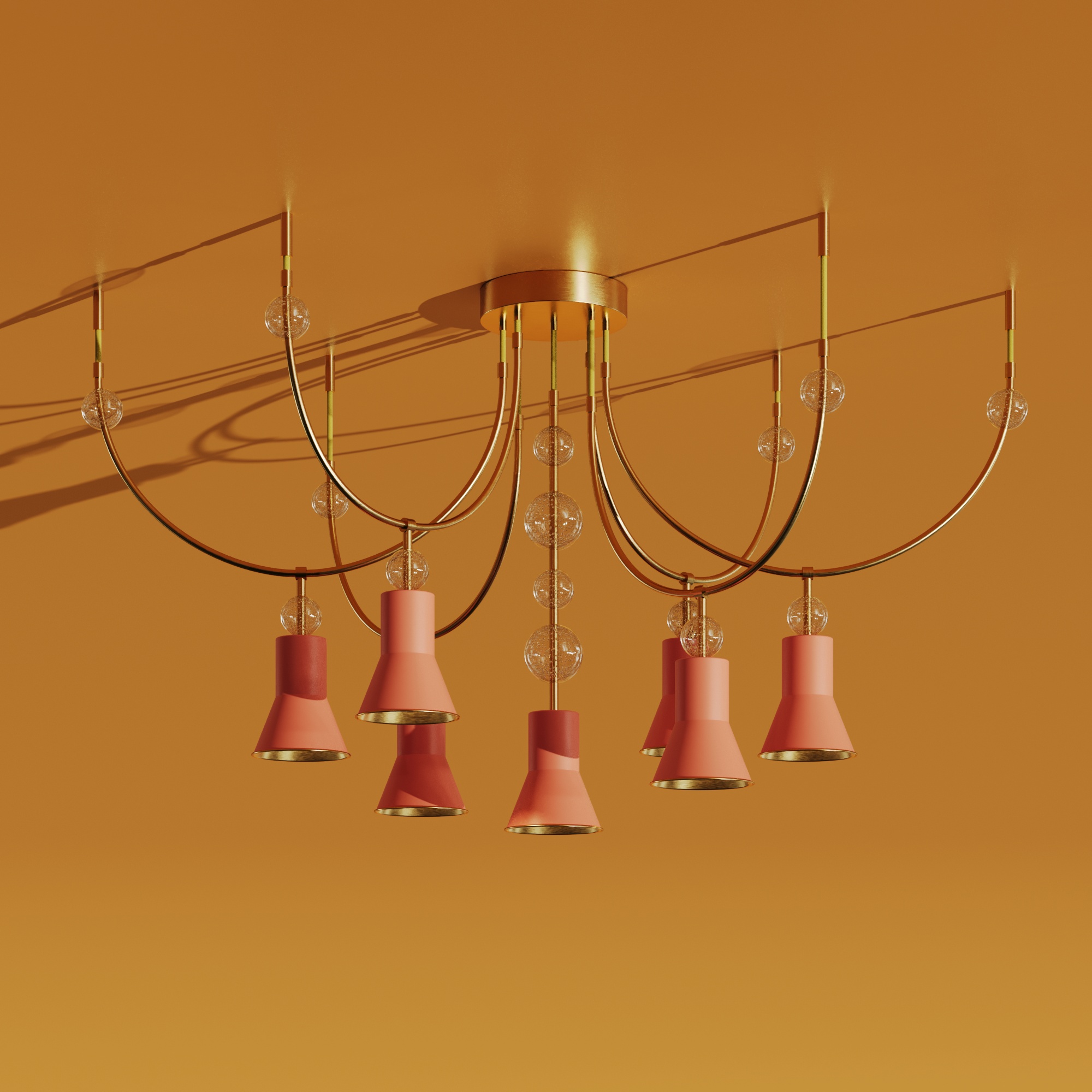 The ARCH 7U is a sculptural pendant fixture that reinterprets the classic chandelier through a contemporary architectural lens. Crafted from brass with gracefully curved arms and downward-facing shades, it creates a refined composition that balances structure and softness. Designed to deliver focused downward illumination, ARCH 7U provides functional light while maintaining a strong decorative presence. Its symmetrical layout and warm materiality make it an ideal statement piece for dining areas, hospitality interiors, and refined residential spaces. A curated selection of finish combinations allows the fixture to adapt seamlessly to both modern and eclectic design environments.