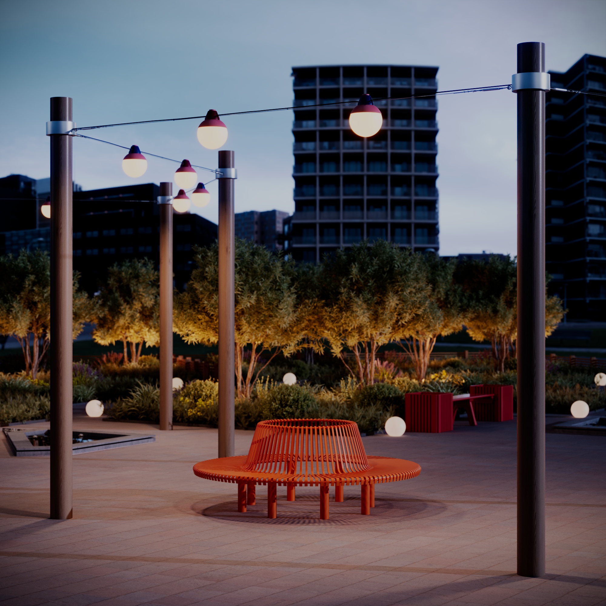 AVERO is an outdoor catenary lighting system designed to deliver balanced illumination and architectural character across contemporary exterior spaces. Suspended along tensioned steel cables, it offers a flexible solution for plazas, pedestrian zones, courtyards, and mixed-use developments. The compact housing is paired with a frosted acrylic diffuser, providing uniform 360° symmetrical light distribution while maintaining a clean, modern silhouette. Engineered for durability, AVERO features IP65 protection, integrated LED technology, and multiple power and CCT options to adapt to a variety of project requirements. Combining reliable performance with refined design expression, AVERO enhances outdoor environments with both functional lighting and visual identity.
