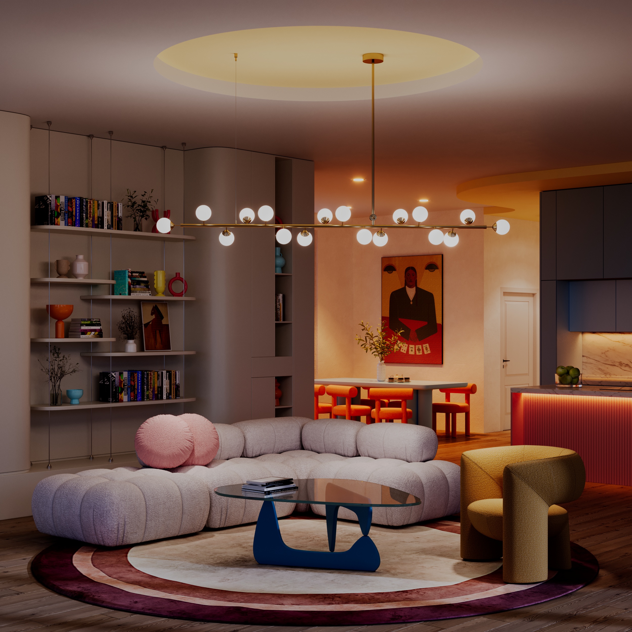 The BUBBLES is a linear pendant fixture that brings a sense of lightness and rhythm to contemporary interiors. Composed of a refined brass structure and evenly spaced glass spheres, it creates a balanced composition that feels both playful and sophisticated. Designed to provide uniform 360° illumination, BUBBLES delivers soft ambient light ideal for dining areas, hospitality spaces, and collaborative environments. Its elongated form emphasizes horizontal lines within the space, while the contrast of solid metal and translucent glass adds visual depth. Multiple finish options allow the fixture to integrate seamlessly into a wide range of modern and transitional interiors.
