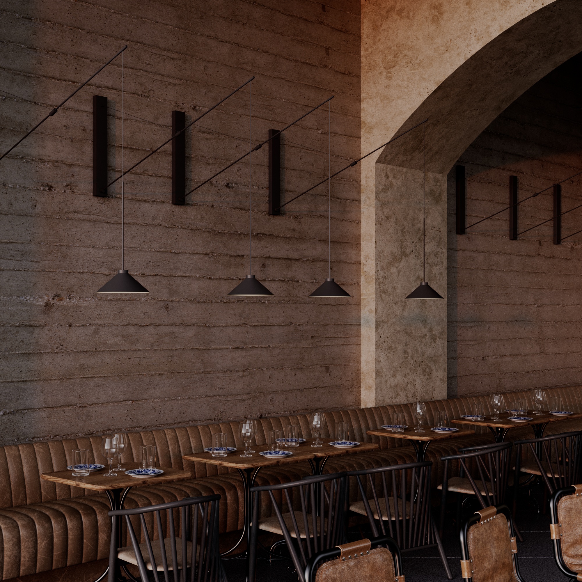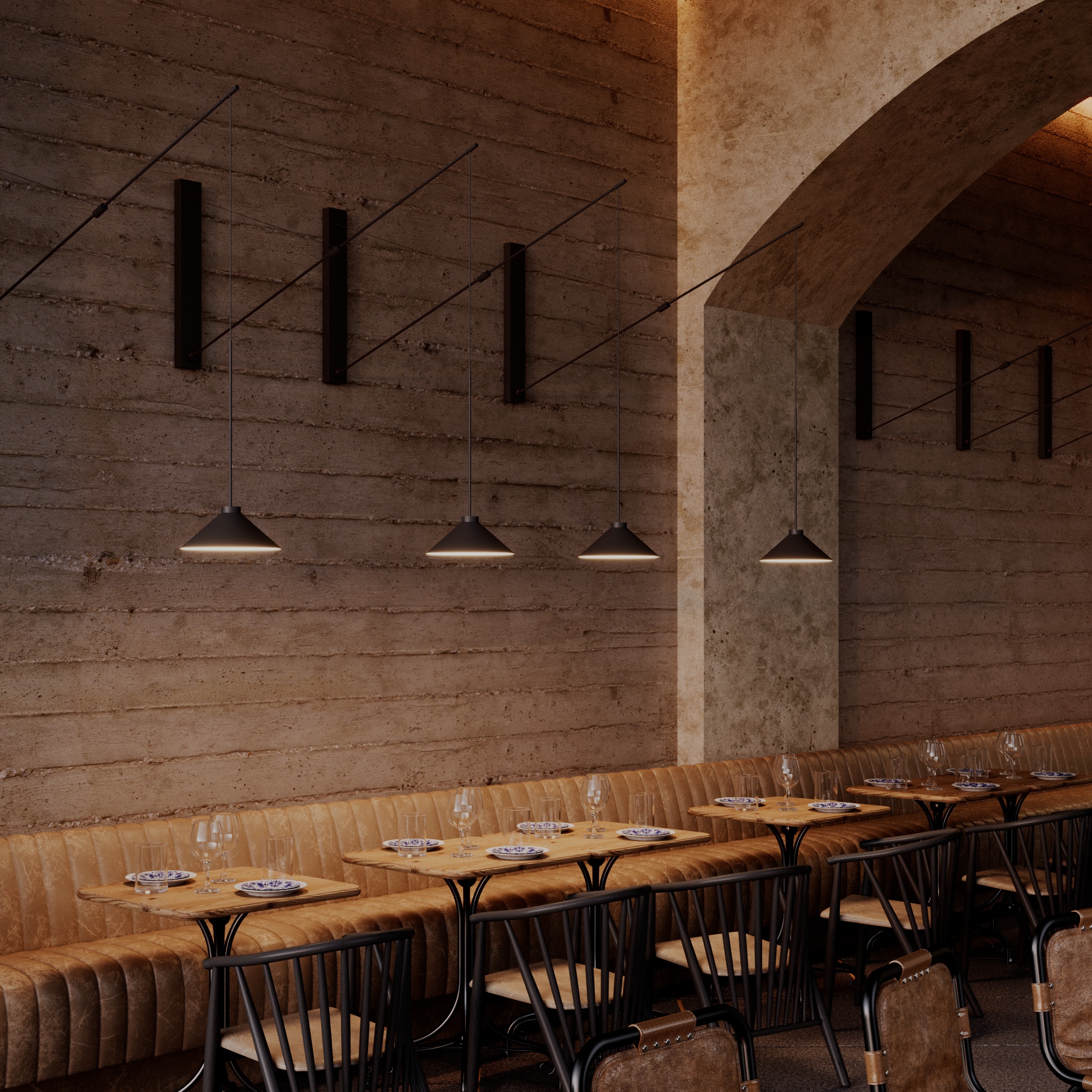 LAVIA is a minimalist pendant luminaire characterized by a lightweight, cantilevered construction and a refined conical shade. The design creates a delicate visual balance between the slender arm and the suspended light element, giving the fixture an elegant and unobtrusive presence within the space. Designed to provide focused downward illumination, LAVIA is ideal for dining areas, hospitality interiors, and intimate residential settings where precise lighting and a calm, atmospheric expression are required. Adjustable suspension allows flexible positioning to suit different layouts and ceiling heights.