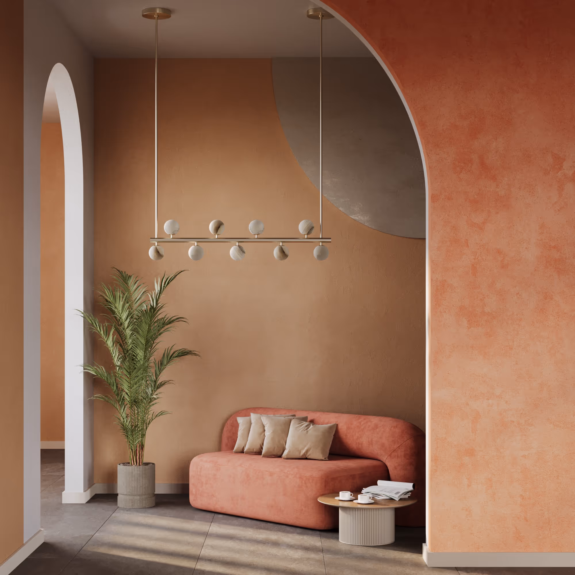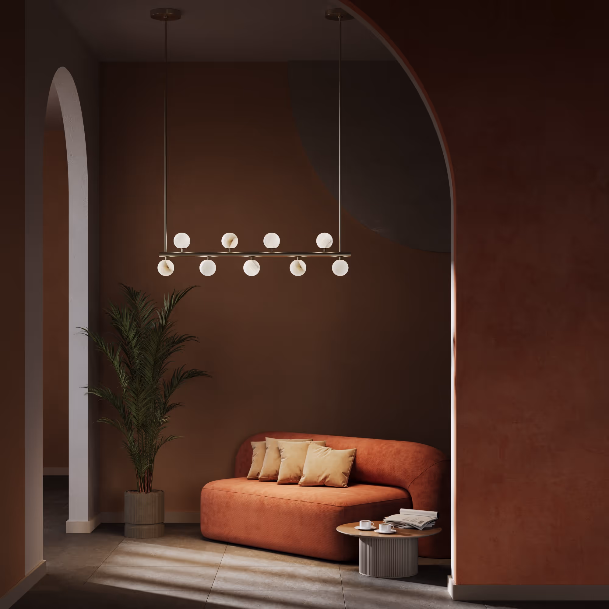 The MERIS pendant is a linear alabaster suspension system featuring a modular arrangement of glowing spheres, each emitting a soft, asymmetric beam. Balancing sculptural rhythm with functional lighting, MERIS brings visual dynamism to hospitality, dining, and contemporary interior environments.