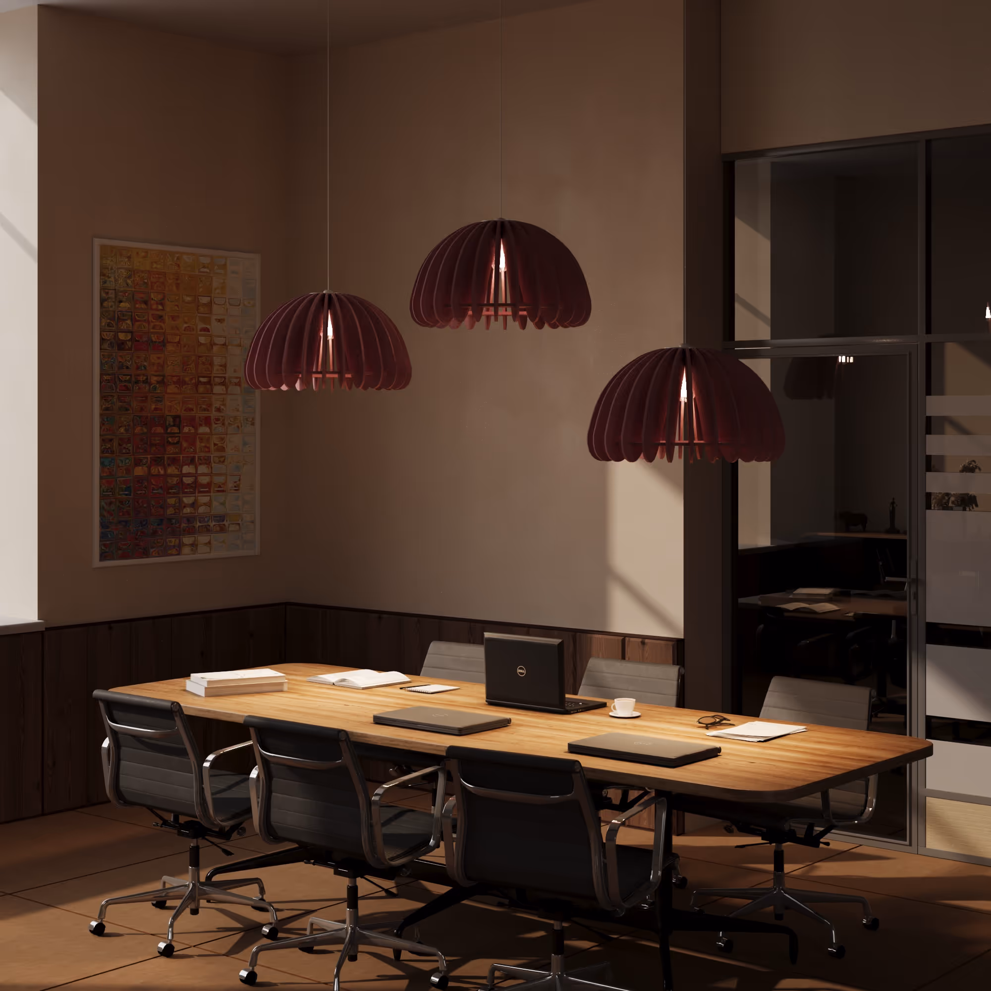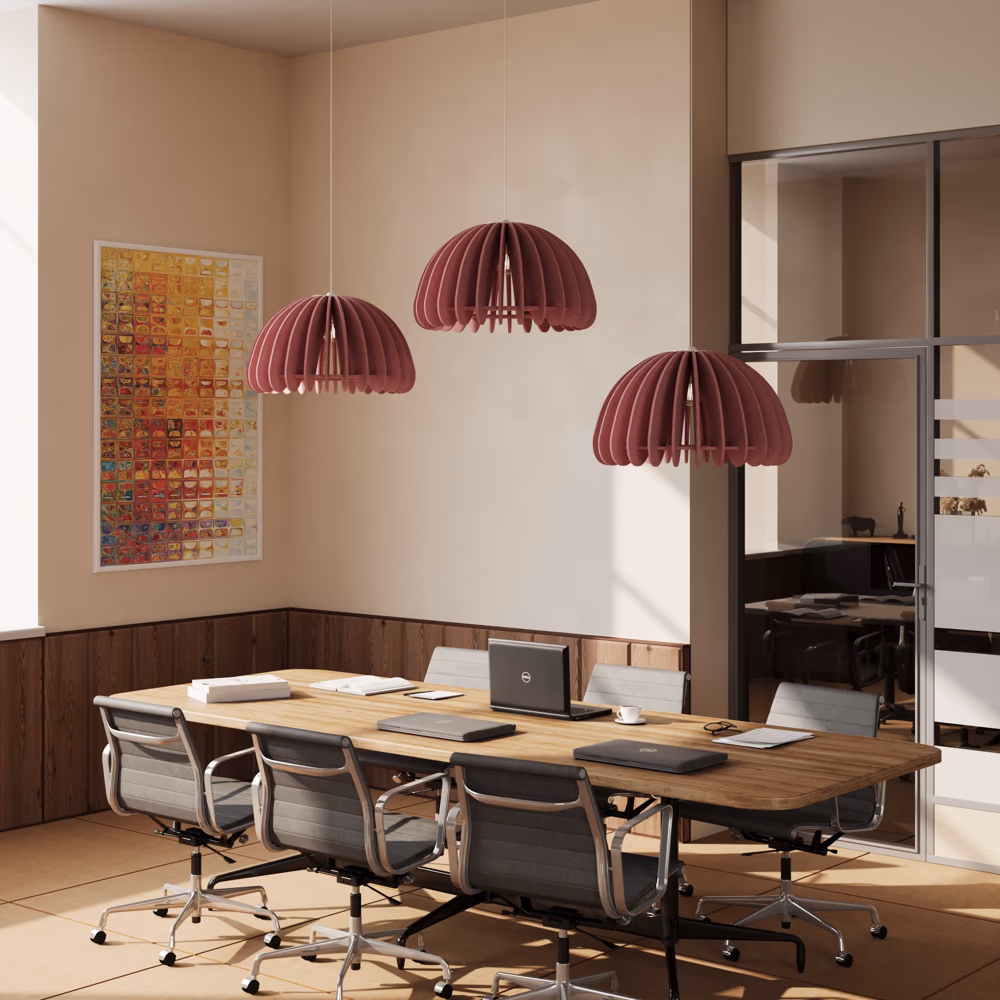 The NUBEN acoustic pendant combines sculptural rhythm with functional lighting. Made from 100% P.E.T. felt, its layered profile delivers both visual depth and acoustic dampening. Designed for environments where sound control and modern aesthetics matter, NUBEN casts a wide, soft beam of direct illumination—ideal for lounges, cafés, and collaborative workspaces.