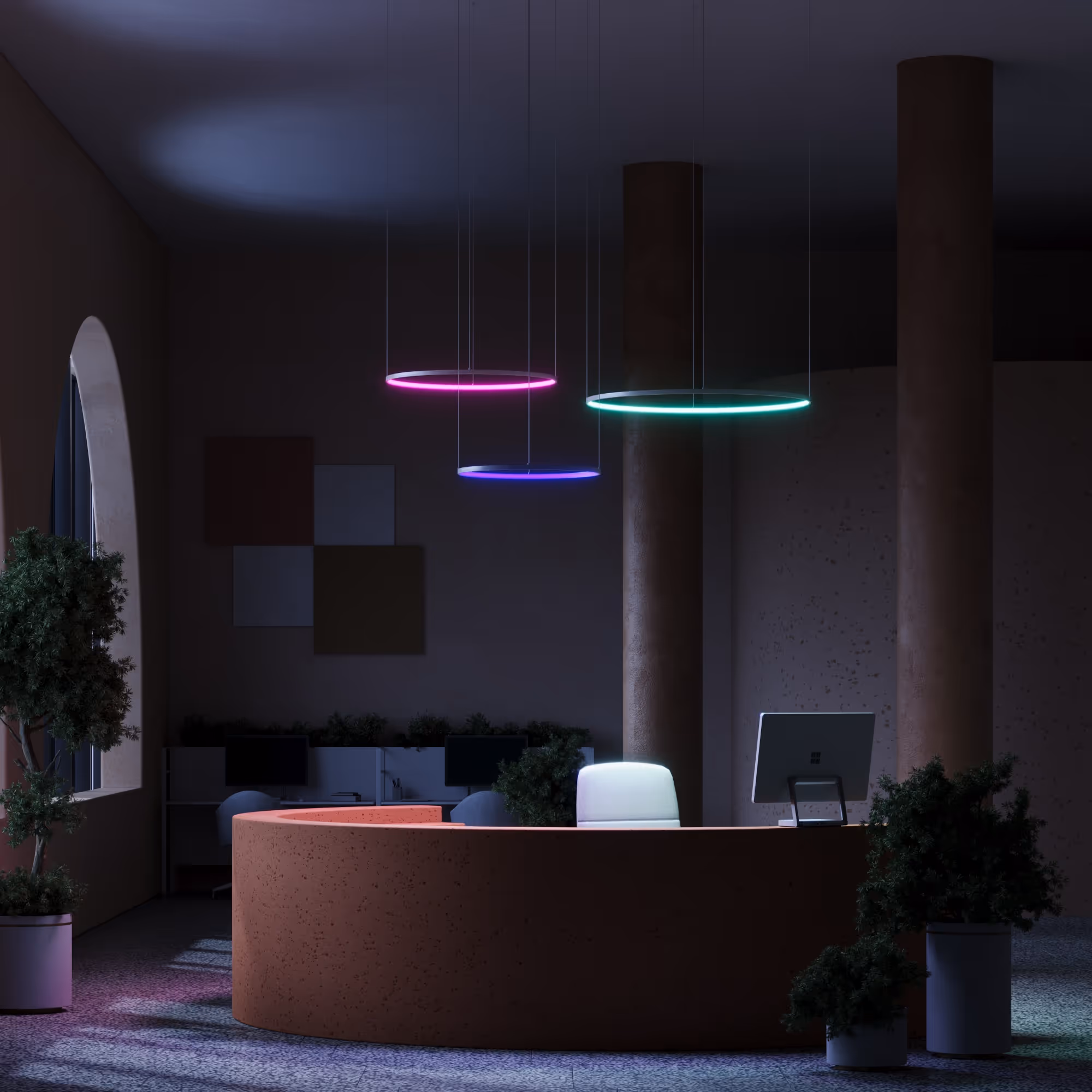 The Orbita Eclipse Circle is a sleek, color-tunable pendant designed to elevate modern interiors with its minimal form and immersive RGB illumination. Offering both upward and downward beam distribution, Eclipse delivers dynamic ambient lighting while maintaining a clean, architectural profile. Ideal for hospitality, commercial, and creative environments seeking both performance and visual impact.