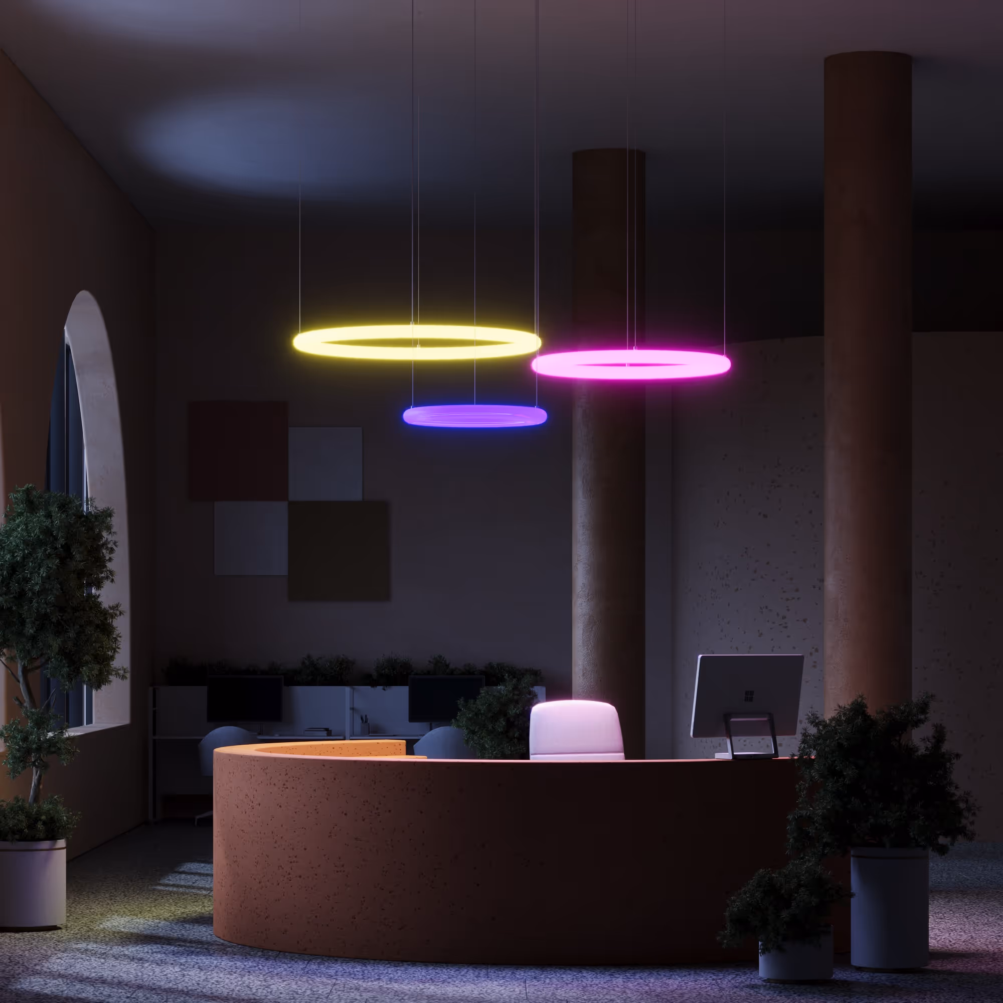 The Orbita Noctis Circle is a striking pendant fixture designed to deliver vibrant 360° RGB illumination in a sleek, seamless ring. Its uniform light output and clean polycarbonate profile make it ideal for modern commercial, hospitality, and event spaces where full-circle visual impact and ambient glow are essential.