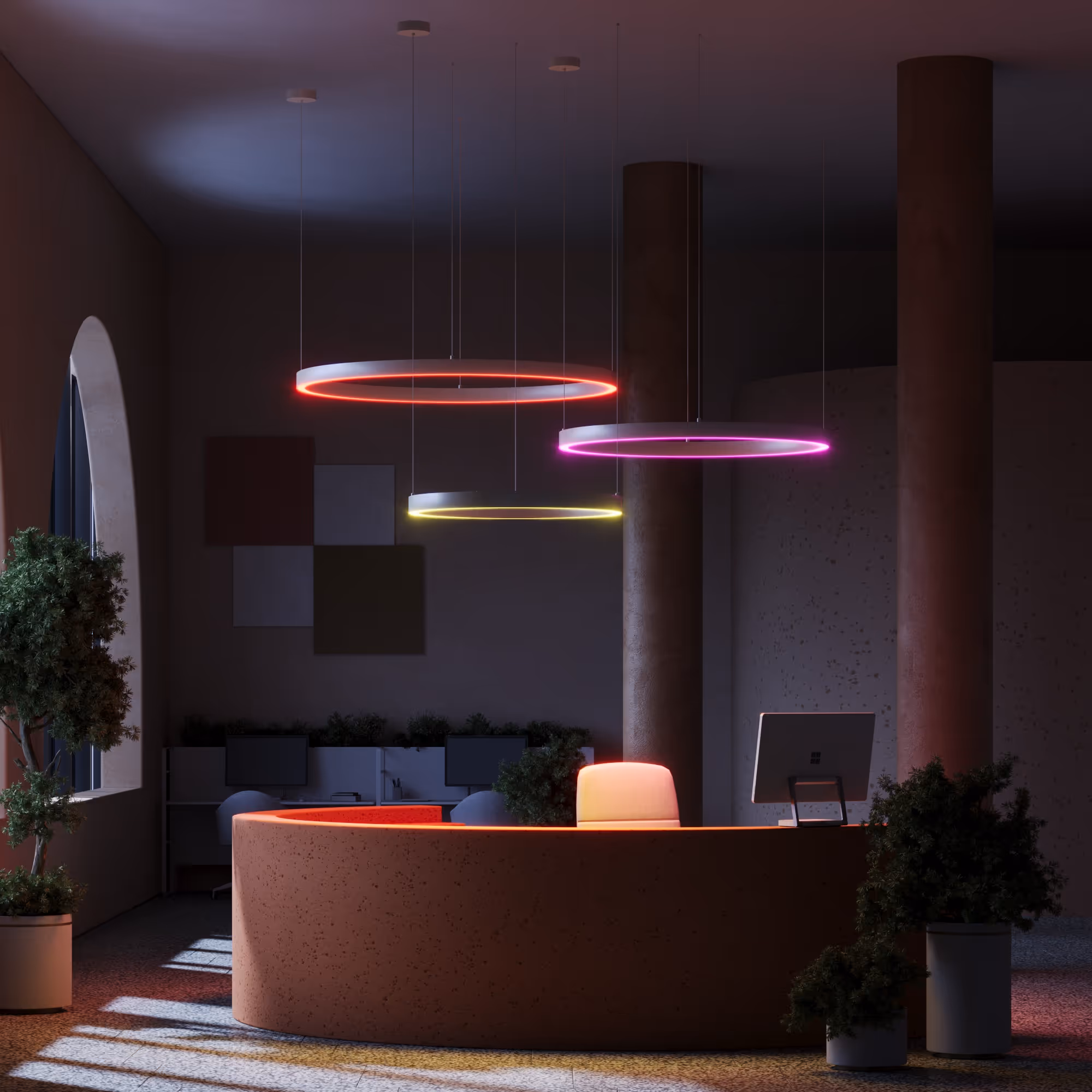 The Orbita Zenith Circle is a bold architectural statement that unites performance and color versatility. Designed with RGB technology and bi-directional (up & down) illumination, Zenith enables layered atmospheres and vivid lighting effects in commercial, hospitality, and creative environments. Its high-output performance and refined form make it ideal for large-scale applications seeking both impact and adaptability.
