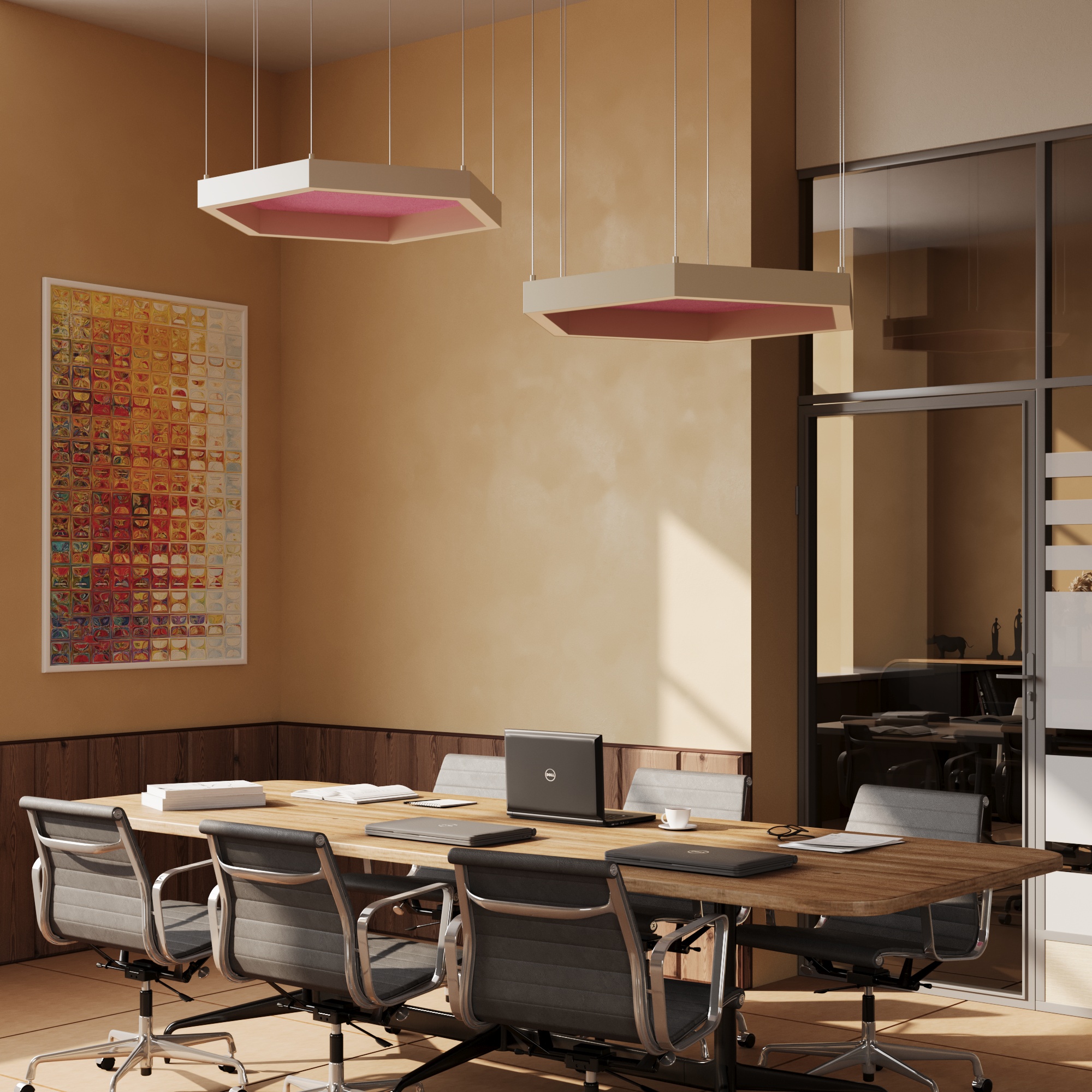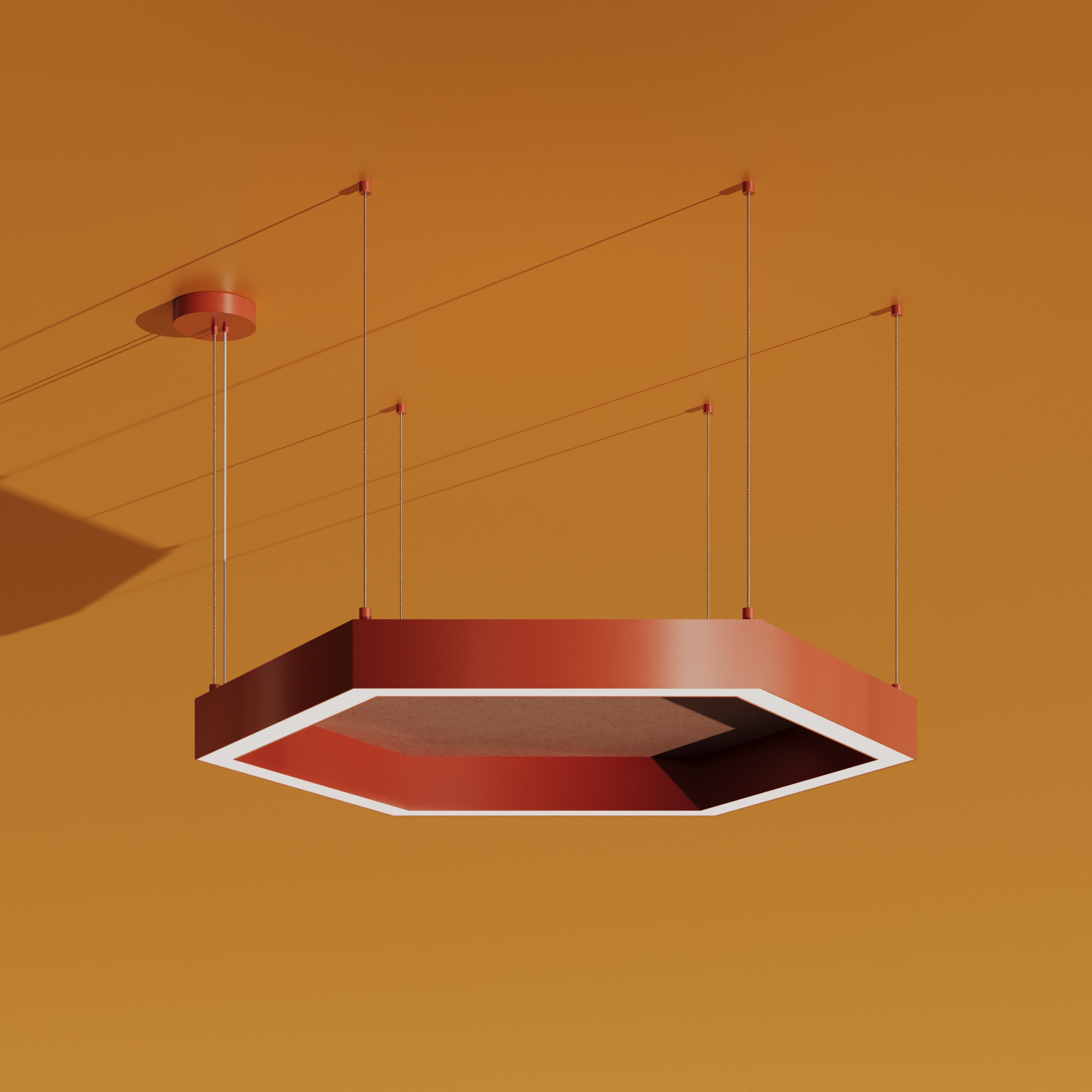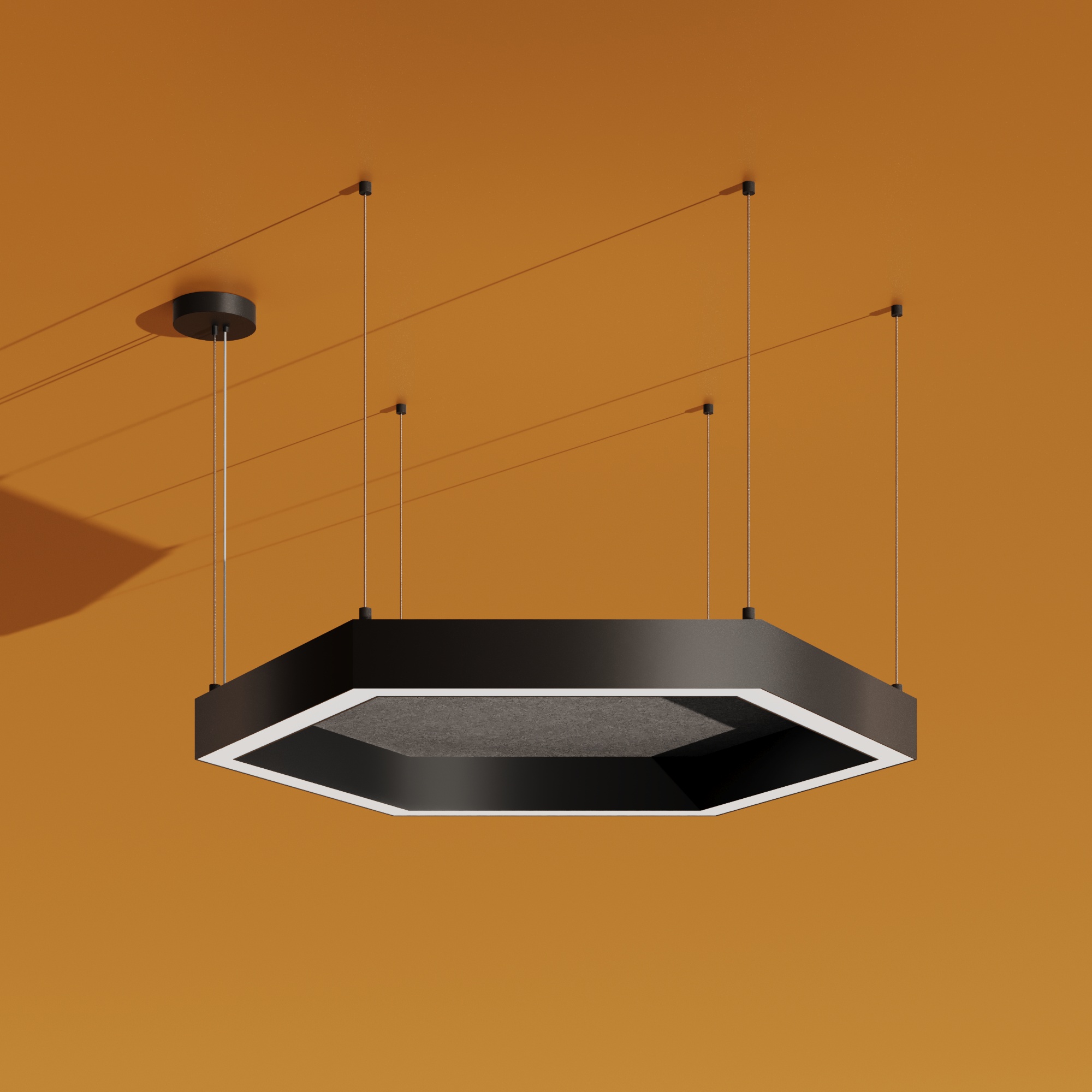 SONEX is an architectural acoustic pendant that combines geometric design with effective sound absorption and soft ambient illumination. The clean hexagonal form creates a strong visual presence while the integrated acoustic felt enhances comfort by reducing ambient noise in open environments. Constructed from aluminum and high-performance PET acoustic felt, SONEX delivers both visual and acoustic functionality. The diffused LED illumination provides balanced, comfortable lighting, making it ideal for offices, hospitality spaces, conference rooms, and collaborative environments. Available in multiple sizes and acoustic finishes, SONEX offers flexibility for a wide range of applications, blending performance, comfort, and modern architectural aesthetics.