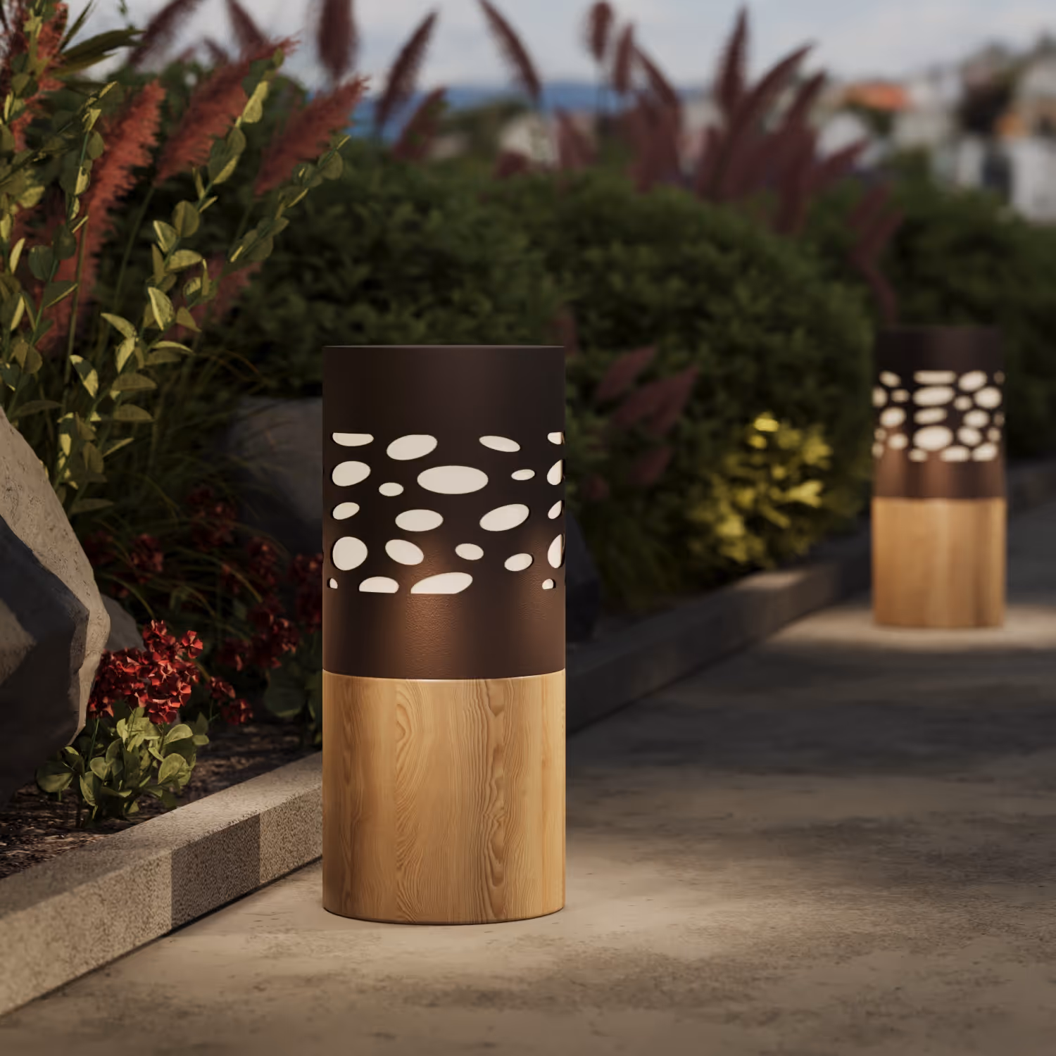 The THORNE LASER G is a decorative garden bollard featuring a laser-cut aluminum shade over a frosted acrylic diffuser, creating patterned 360° ambient illumination. Combining sculptural aesthetics with functional light output, it offers IP65 protection, dimmable LED performance, and finish options suited for modern outdoor environments.