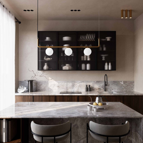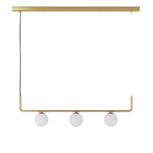 TRIS is a sculptural pendant luminaire defined by a refined linear composition and carefully balanced proportions. The brass structure supports frosted glass diffusers arranged with precision, creating a light and elegant visual expression that emphasizes geometry and material contrast. The design combines decorative character with architectural clarity. Designed to deliver soft 360° diffused illumination, TRIS is well suited for dining areas, living spaces, and hospitality interiors where lighting serves as both a functional element and a visual focal point.