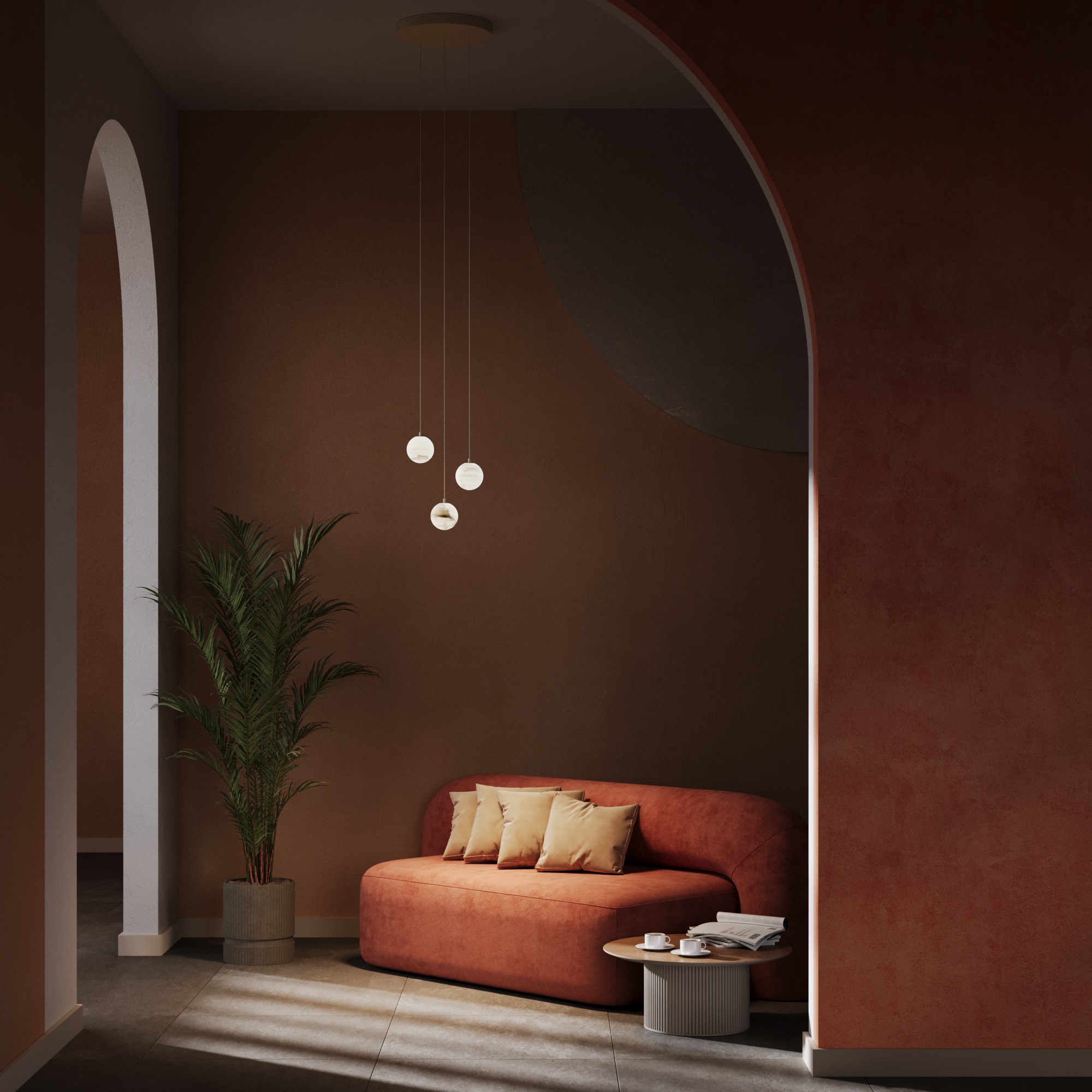 The VELAINE pendant is a minimal alabaster sphere that radiates soft 360° ambient light, creating a glowing centerpiece with sculptural warmth. Its omnidirectional distribution makes it ideal for atmospheric compositions in hospitality, wellness, and residential interiors.